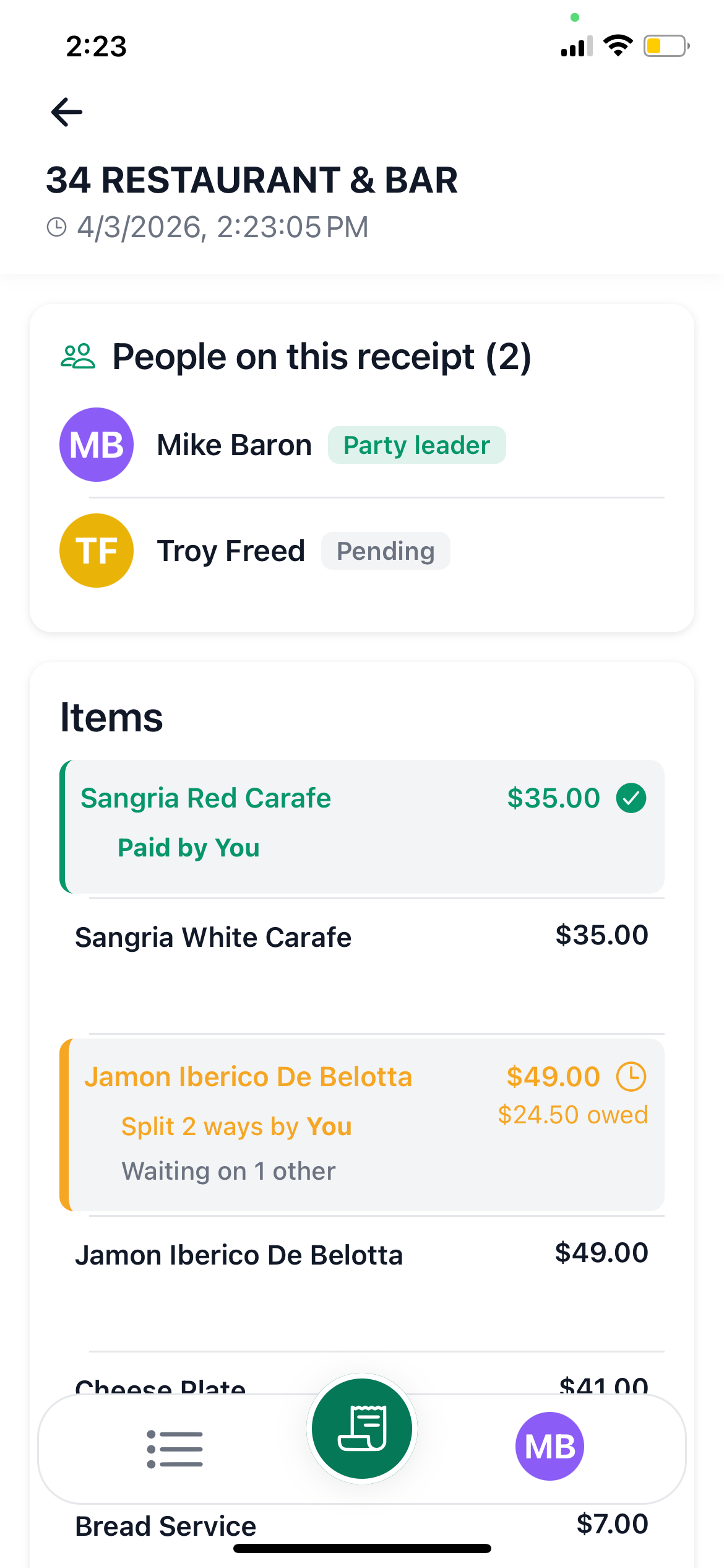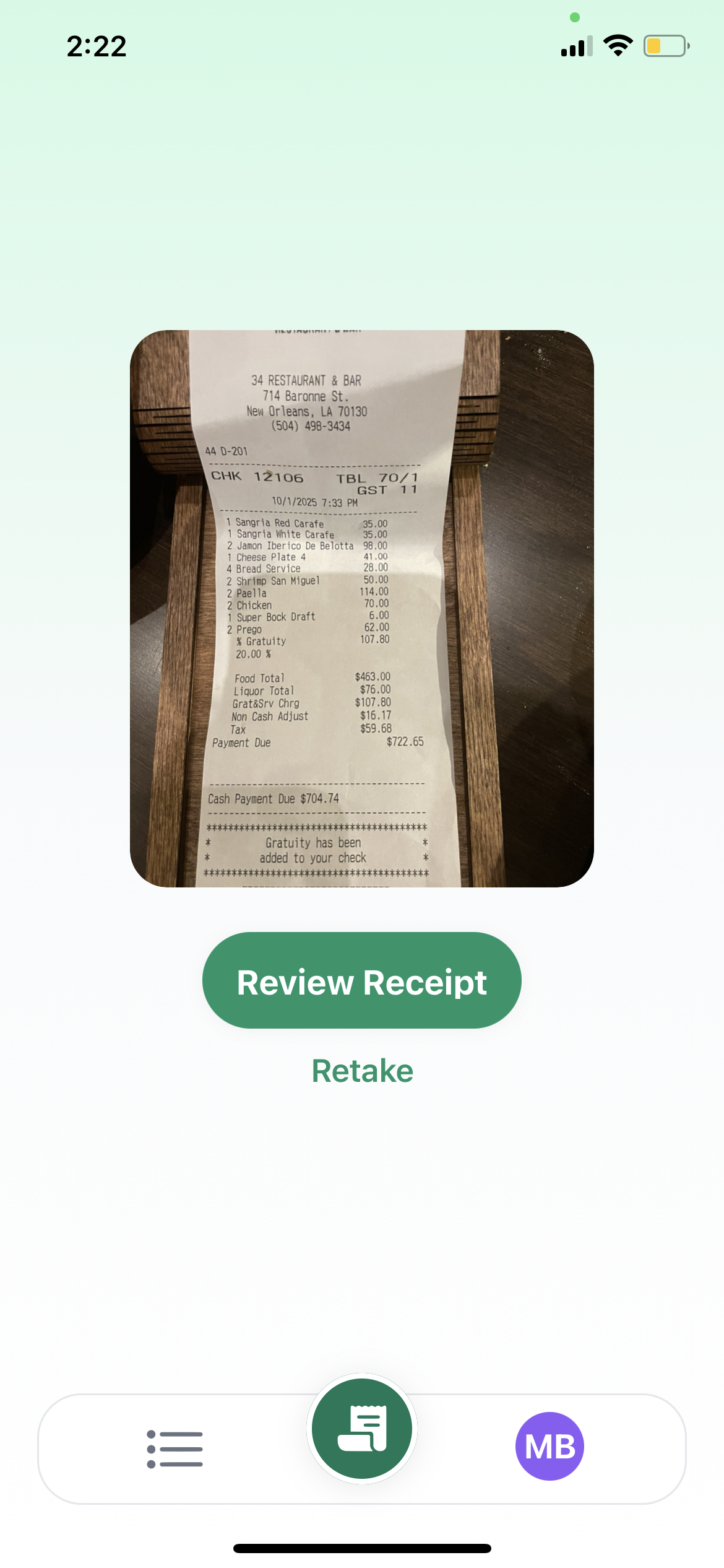 Simply snap a photo or upload a receipt and we'll parse it into an itemized list in seconds — items, tax, and tip included. The party leader can make any edits before sharing.